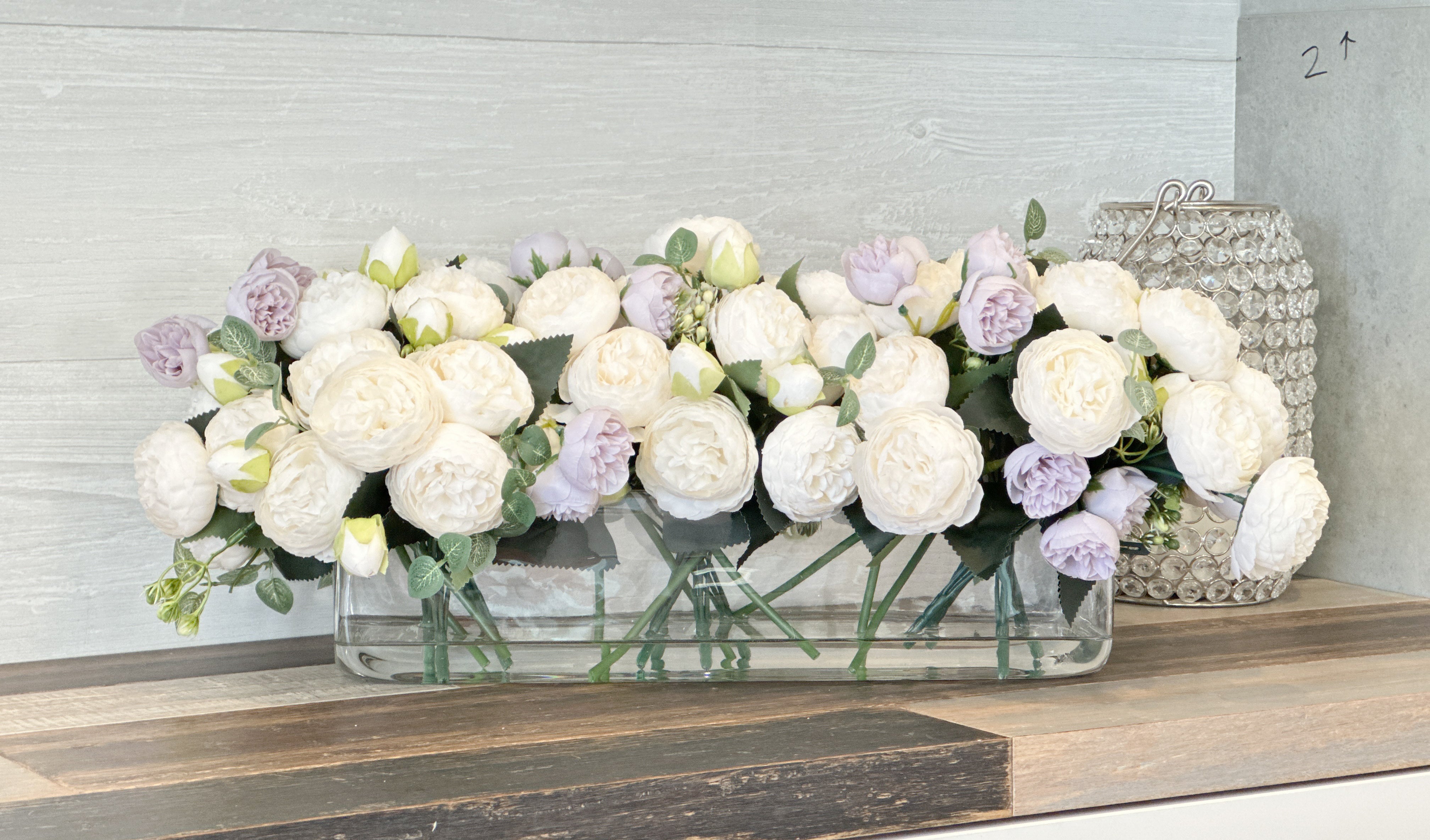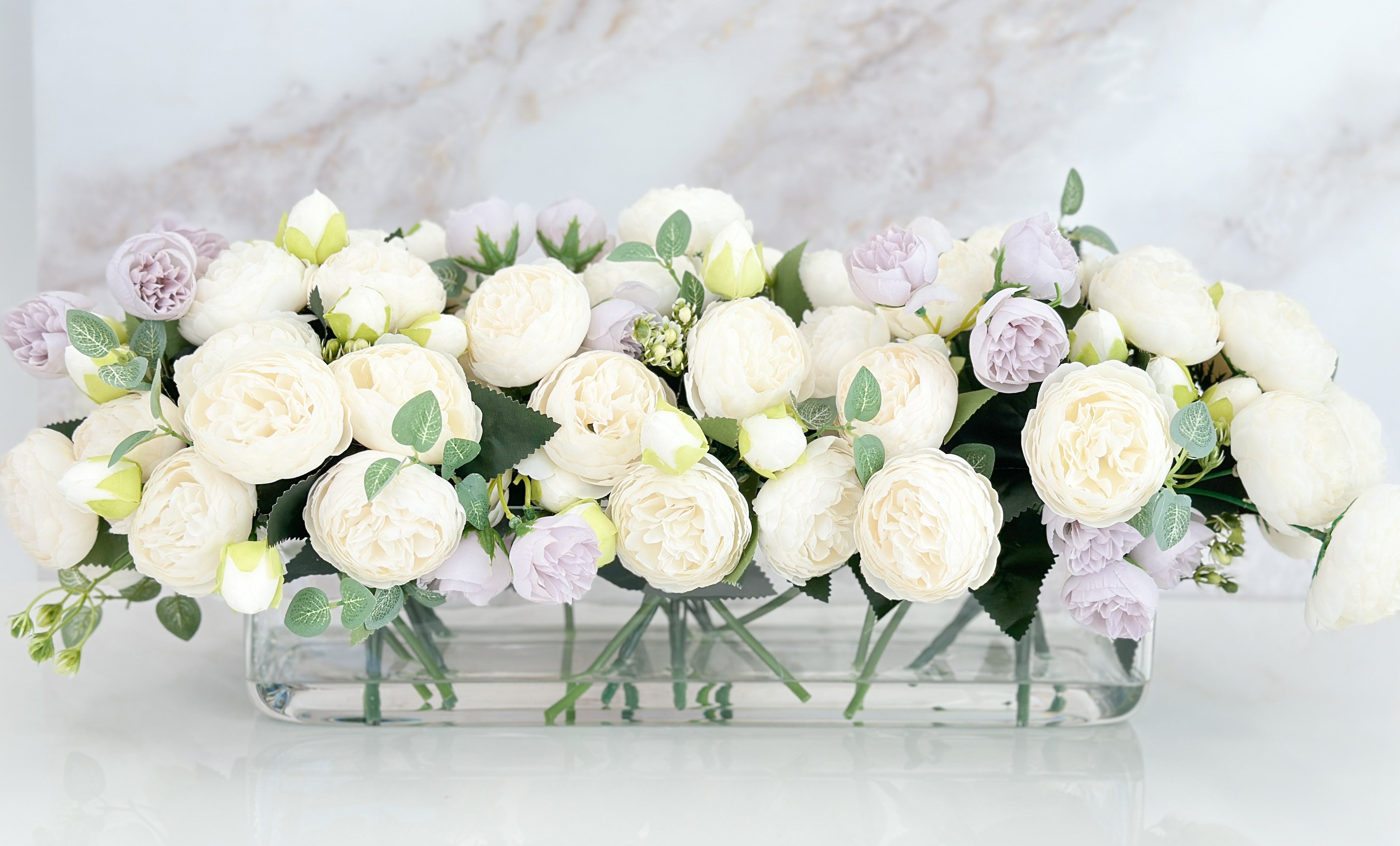 16” White Lavender Rose Peony Arrangement Modern Artificial Faux Centerpiece Floral Flower Arrangement Silk Flowers Glass Vase French Decor